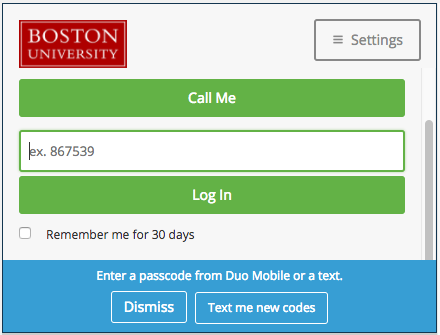 When you log in to a Boston University Web page that requires two-factor authentication, a login screen like this will be displayed.