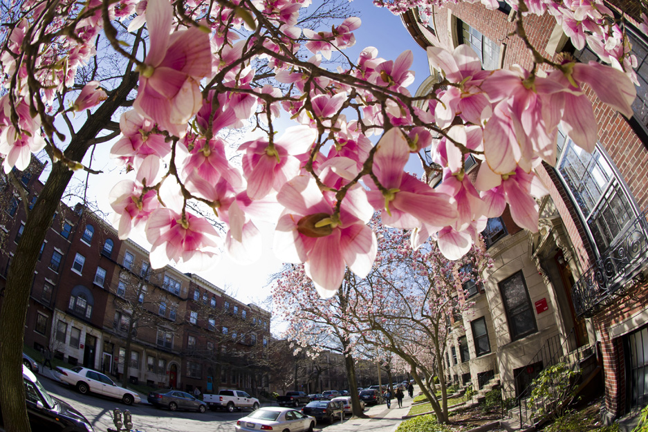 April Showers, Bring May Flowers You know the saying—those April showers through Thursday should help the May flowers. Bay State Road wears a rosy canopy already. Photo by Kalman Zabarsky