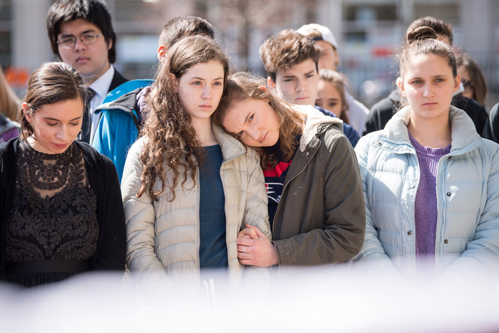 Organized by CFA Student Government and BU Against Gun Violence, the National School Walkout commemorating the 19th anniversary of the Columbine H.S. shootings was held on Marsh Plaza April 20: BU Academy students Steph Gratiano (from left), Michelle Lisak, Mackenzie Urbano, and Vika Maslova. Photo by Cydney Scott