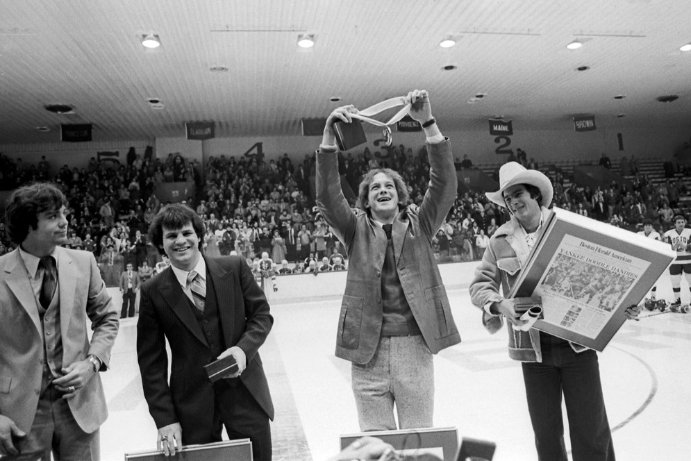 Never to be forgotten: In February 1980, the underdog US men’s Olympic hockey team set the nation on fire by taking gold at Lake Placid. On February 26, the four Terrier members of that Miracle on Ice team were feted at BU: Jim Craig (SED’79) (from left), captain Mike Eruzione (SED’77), Jack O’Callahan (CAS’79), and Dave Silk (CAS’80, MET’92, Questrom’93). Photo by BU Photography