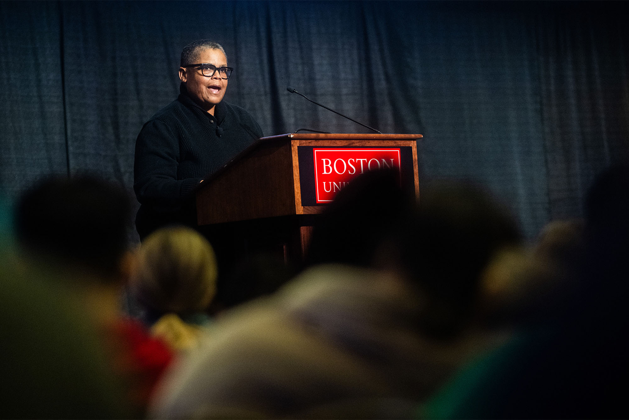 Keeanga-Yamahtta Taylor, author and professor of African American studies at Princeton, delivered the keynote address at Boston University’s MLK Day observance at the George Sherman Union, January 15, attended by about 450 people. The annual event, cohosted by the city of Boston, honors civil rights icon Martin Luther King, Jr. (GRS’55, Hon.’59). This year’s theme, Whose Quest for Peace and Justice?, was inspired by King’s acceptance speech for the 1964 Nobel Peace Prize. In addition to Taylor, other speakers included Boston Mayor Michelle Wu, BU President ad interim Kenneth Freeman, Howard Thurman Center director Nick Bates, and BU students Destiny Perkins (Pardee’25) and Carina Spinola (CAS’26). Photo by Jackie Ricciardi