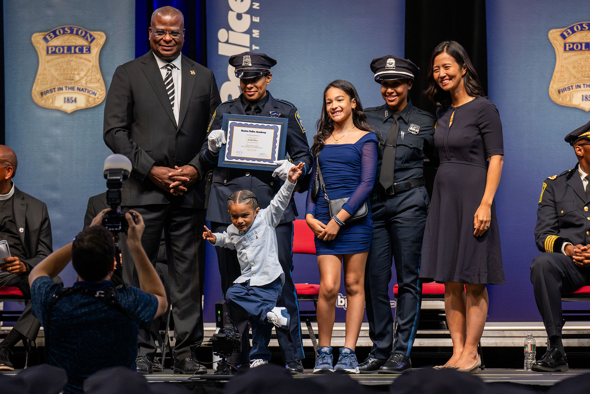 Boston University hosted the 2025 Boston Police Academy graduation ceremony at Agganis Arena August 22. Among this year’s 103 Academy graduates (100 Boston Police recruits, 27 of them women, and 3 from outside agencies) was Janibel Brea, here with Boston Police Commissioner Michael A. Cox, Sr. (Questrom’18) (from left), Brea’s son Myles, 4, daughter Janayah, 10, friend Brookline Police Officer Katherine Irizarry, and Boston Mayor Michelle Wu. Photo by Cydney Scott