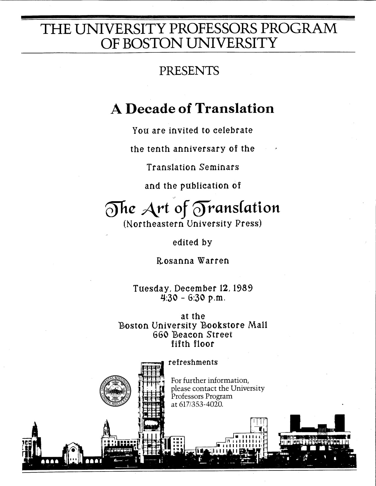 In 1989, Warren published an edited volume, The Art of Translation: Voices from the Field, based on speaker presentations of the initial several years of the Seminar, dedicating it to Cardona, “the godfather” of the Translation Seminar, as she wrote. The publication was celebrated together with the tenth anniversary of the “Translation Seminars” with a party on December 9, 1989.