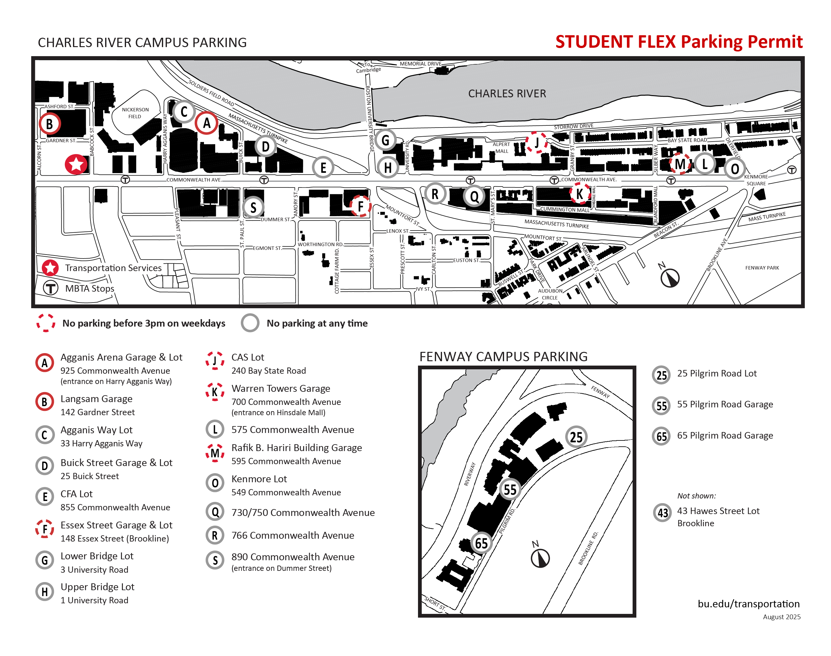 240 Bay State RoadPermits accepted: Employee Commuter, Employee Flex, Employee Off-Peak Commuter, Evening Faculty, Student Commuter (after 3 pm), Student Flex (after 3 pm), Student Evening Commuter