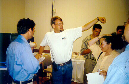 Much of the day-to-day work of the Congress was originally handled by Professor Olson and Mr. Bud Heckman, a doctoral student at Boston University. However, as the time of the Congress drew closer, the staff expanded to three full-time employees: Dr. Kevin L. Stoehr, Program Coordinator, Dr. Mark D. Gedney, Assistant Program Coordinator, and Miss Georgia Maheras, Chief Financial Officer, as well as several part-time employees. During the week of the Congress, a well-trained group of over 60 volunteers worked in the registration area, the exhibit hall, and monitored the rooms in which the sessions were held. Here, Kevin Stoehr (center, with walkie-talkie) leads a volunteer orientation the afternoon before the Congress opened. |