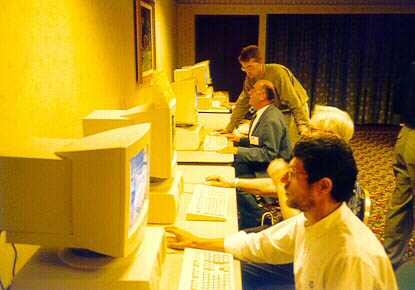 One of the innovations featured at the Twentieth World Congress was the Cyber-Cafe. The future of philosophy on the Internet is bright and shining, and few are better able to serve as a trusted guide than Tom Stone (pictured, standing). Tom was the webmaster for the Twentieth World Congress site (the present Paideia Project On-Line site), and also manages his own EpistemeLinks.com site. |