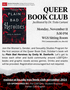 The Queer Book Club, facilitated by WGS faculty Dr. Tesla Cariani, will meet monthly to discuss a pre-selected LGBTQIA+ book. October’s book is Plain Bad Heroines by Emily M. Danforth. This group is designed to be an opportunity for students to get to know each other and to build community around LGBTQIA+ books and graphic novels across genres. Drinks and snacks will be provided.