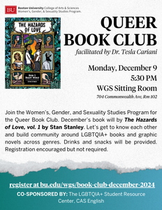 The Queer Book Club, facilitated by WGS faculty Dr. Tesla Cariani, will meet monthly to discuss a pre-selected LGBTQIA+ book. December’s book is The Hazards of Love, vol. 1 by Stan Stanley. This group is designed to be an opportunity for students to get to know each other and to build community around LGBTQIA+ books and graphic novels across genres. Drinks and snacks will be provided.