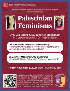 Please join Boston University’s Women’s, Gender, and Sexuality Studies Program for Palestinian Feminisms, featuring talks by scholars Lila Sharif and Jennifer Mogannam.