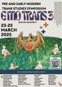 This conference brings together scholars working at the intersections between the fields of trans studies, medieval studies, and early modern literary studies. While the projects of historicizing trans studies and queering premodern and early modern studies are ongoing, it is surprising that there has thus far been relatively little engagement with trans studies by scholars working on ancient, medieval, and early modern literature and history, especially given our field’s long genealogy of feminist and queer approaches. With this conference, we ask: what, if anything, makes the ancient, medieval, and early modern period rich for trans studies? What does trans studies bring to the medieval/early modern and what, in return, can medieval/early modern studies bring to trans theory and analysis? How does this approach align with earlier feminist inquiries about gender and with the project of “queering the medieval,” or “queering the Renaissance,” and where does it require new pathways? What pedagogical opportunities open up from bringing the vocabulary of trans studies to earlier periods?