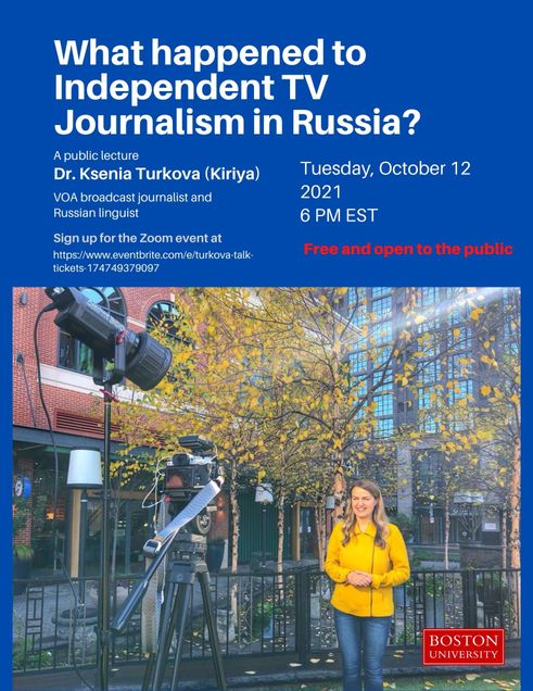 What Happened to Independent TV Journalism in Russia (10-12) By: Brigid Mack October 6, 2021 Join us for this culture pass event with Dr. Ksenia Turkova (Kiriya) on October 12th! Share this:ShareShare on FacebookClick to share on Twitter View all posts
