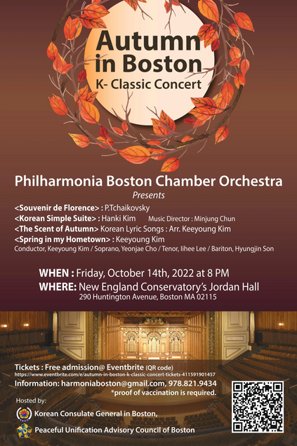 The Autumn in Boston K-Classic Concert will be held on Friday, October 14th, 2022 at 8pm. The event will be at the New England Conservatory’s Jordan Hall (290 Huntington Avenue). The event has free admission, and registration can be found here