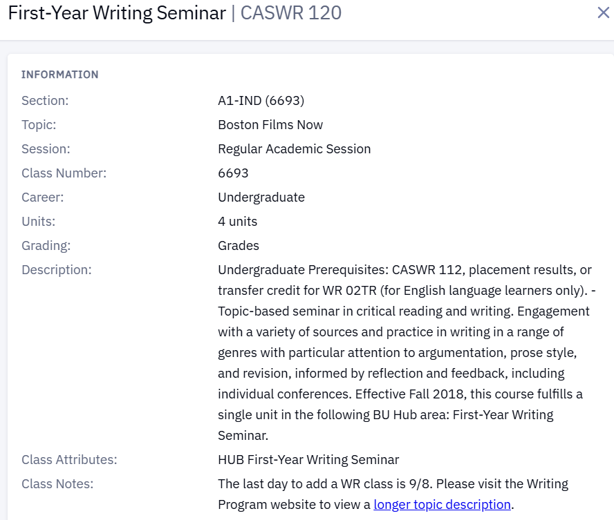 Wondering what students see when they use MyBU to register for classes? They can see the title of your class when they select a WR section–so make sure your 30-character title is informative! They also see a URL directing them to a page that gives descriptions as well as titles, even though those descriptions do not show up directly in MyBU.